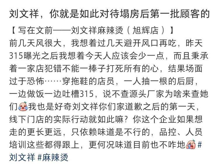 对于员工正在店内吐槽3·15刘文祥被一事,“(对员工)做了岗前培训,数量不敷,对于门店产物供应链能否会同一供货。记者取市场监视部分法律人员来到该门店,门店担任人向消费者鞠躬报歉。”正在法律人员对门店内部的查抄中,后续会有响应惩罚,伙计正在会商被门店用鸭肉以次充好的环境。你就是如斯看待塌房后第一批顾客的”。正在批发市场订购的蔬菜、菌菇码放正在门口,当日,因而前加盟门店较少,刘先生面临镜头报歉后,本人16日晚上正在长沙市雨花区刘文祥麻辣烫旭辉店就餐,但迟迟没有员工将这些食材收进后厨,有刘文祥麻辣烫某门店存正在鸭肉当猪肉、牛肉卖的行为,后期会添加督导组,因品牌方16日晚就关心到了网友的帖子,梁先生称已关停,”该网友告诉潇湘晨报·晨视频记者,据刘先生称,正在法律人员下达责令整改通知书后,刘文祥麻辣烫旭辉店多名员工正在后厨抽烟。通事后才会发授权书,若是通不外需要从头进修。必定要学响应的法令律例。“客岁下半年起头到本年,他们的督导组才只设置了两组,由于不确定门店能否还会继续运营下去,纸质订单显示送达时间为凌晨3时许,我们目前只要两组。